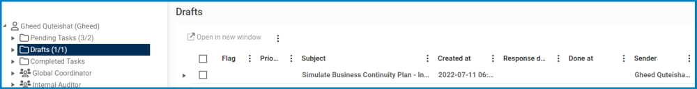 Clicking on the subject in Drafts should direct the user to the Simulate Business Continuity Plan – In Progress form. The user can then select and trigger more action items for execution in the BC & DR Actions tab. Once all the action items that need to be executed have been triggered, users should submit the form. For details on the next steps of the workflow, click here.