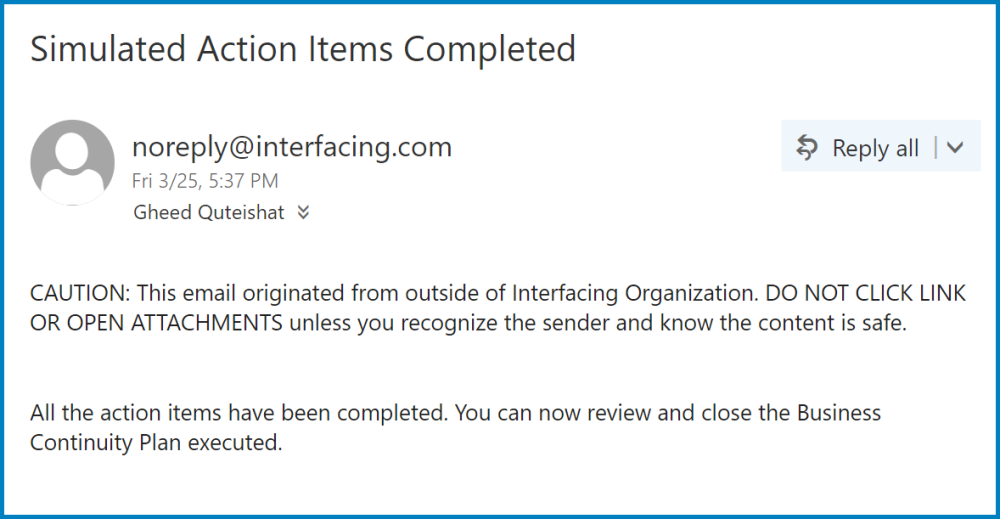 They will also receive two emails. The first email will inform them that the simulated action items have been completed and that the BCP is now ready for review and closure.