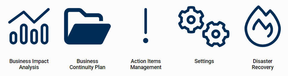 The Business Continuity Management (BCM) application is composed of 5 sections: