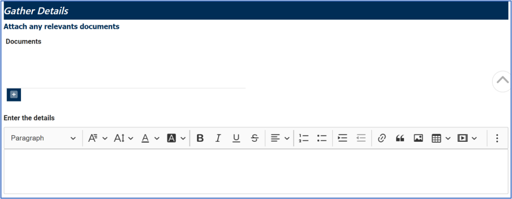 - Enter the Details: This is a description box that allows users to input any relevant details. In this field users can insert headings, bullets, images, tables, links, and media files (as well as change font colors, font sizes, background colors and more).