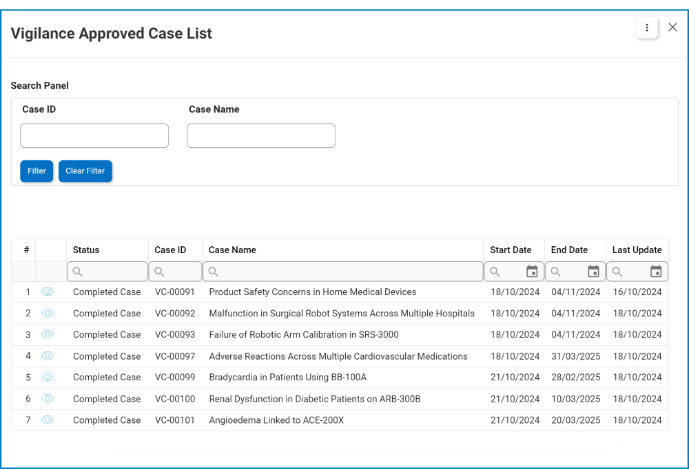 - Select Case(s): This is a single-select dropdown field that retrieves the list of approved vigilances cases. It is a mandatory field. It allows users to select a case by either entering its name or clicking on the arrow icon.