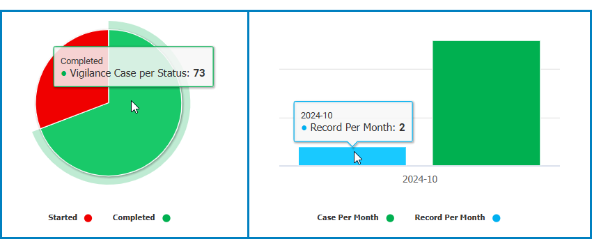 In this module, users can access visual representations of vigilance case and record metrics.