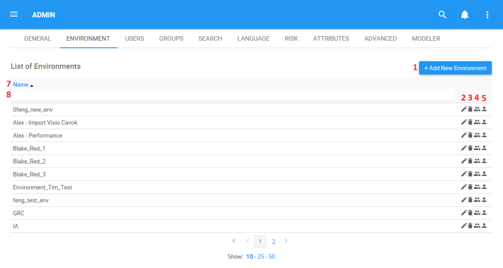 The Environment tab under the System Admin section displays a table with the List of Environments. Within the Environment tab of the System Admin section, Administrators can do the following: