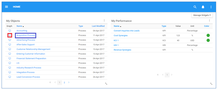 | My Objects | A Widget window used to feature any object within the EPC. These items can be processes, process components and/or associated items. This Widget can feature: 1. Asset 2. Document 3. End 4. Gateway 5. Intermediate 6. Objective 7. Org Unit 8. Process 9. Report 10. Resource 11. Role 12. Start 13. Task 14. Key Performance Indicators (KPIs) 15. Key Control Indicators (KCIs) 16. Key Risk Indicators (KRIs) |