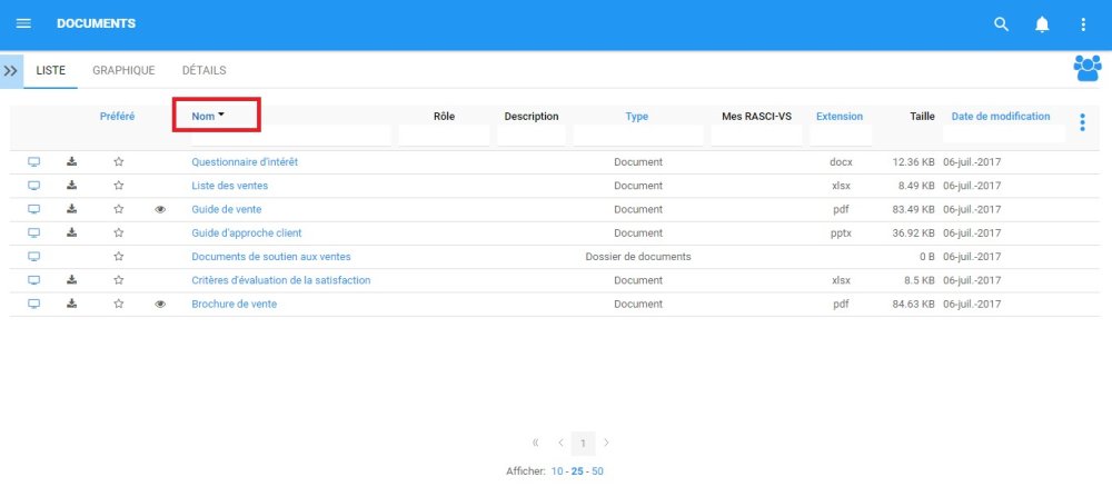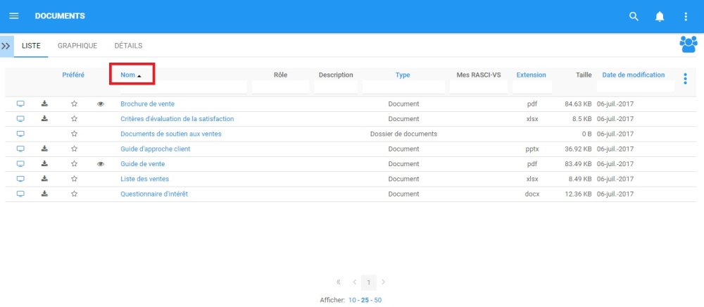 Le tri permet aux utilisateurs de classer les documents en fonction des critères sélectionnés. Vous pouvez trier des résultats de liste pour n’importe quel titre de colonne qui est en BLEU.