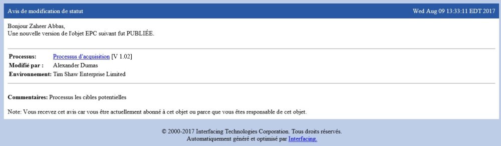 Les utilisateurs abonnés ou associés au processus en cours de modification recevront une: