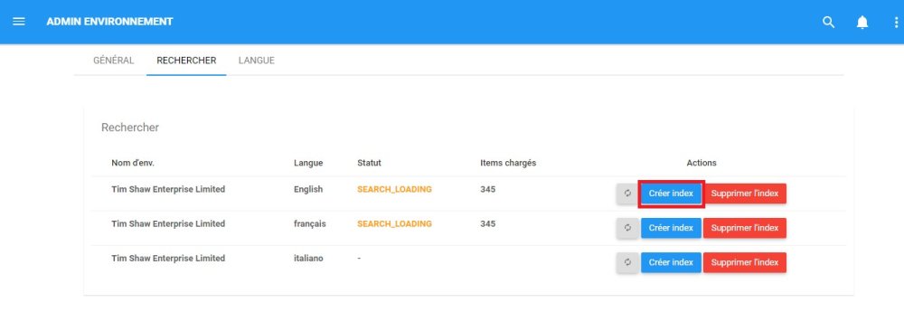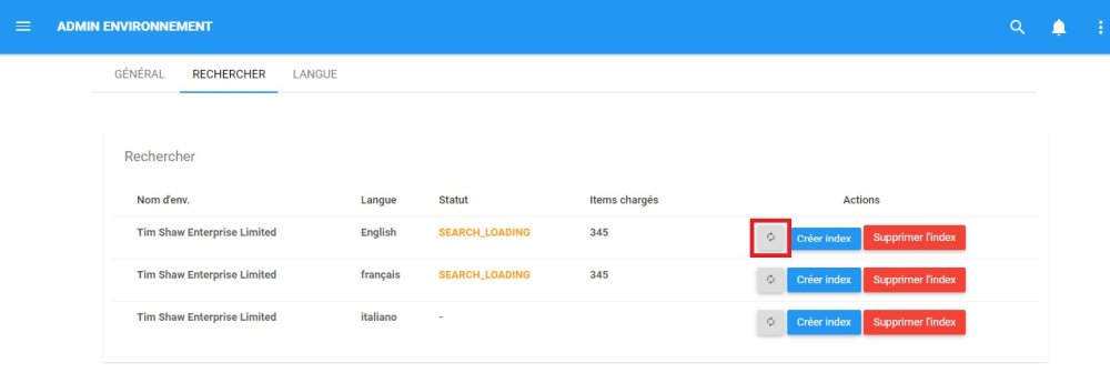 5. Une fois l’index créé, sélectionnez l’icône de rafraîchissement