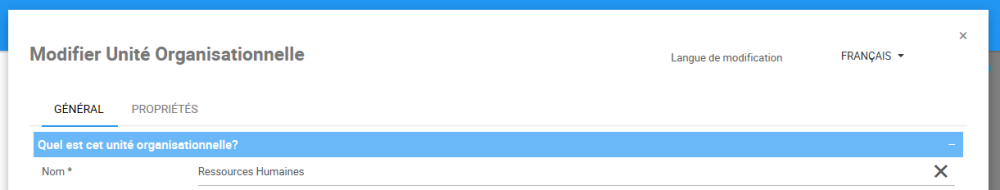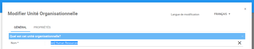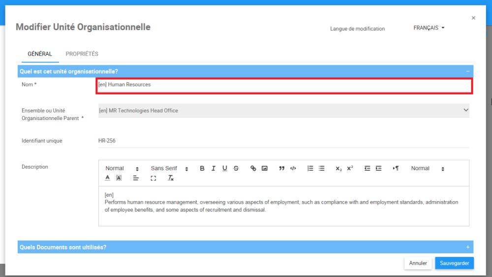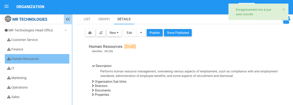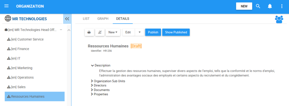 - Change the Content language of your profile to French, and navigate to the “Human Resources” Organization Unit. The content will be in French.