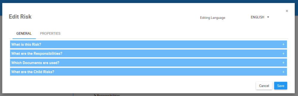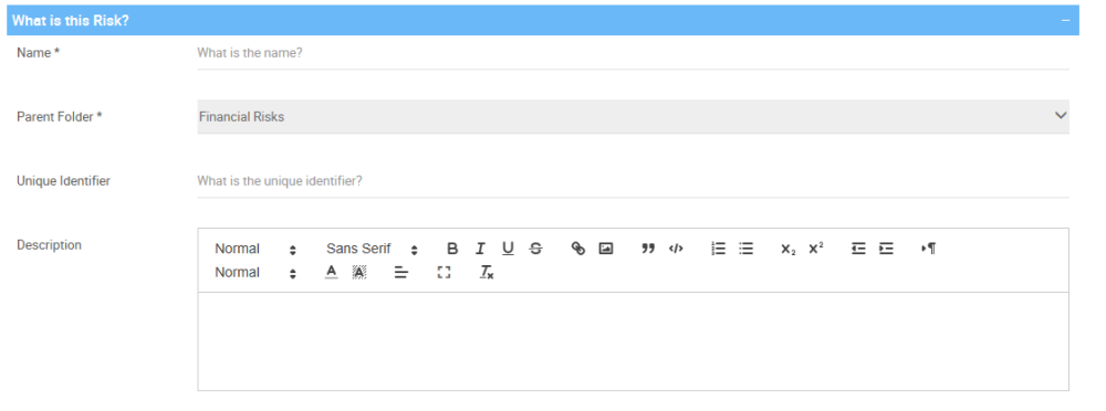 | Description | This field describes the Risk in detail. The rich text format allows for text formatting, images, URLs, tables, etc. |