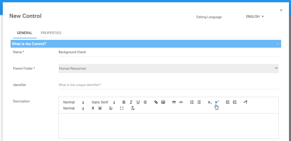 icons to expand and hide the different sections within each tab of the New Control Window. Input the right information about the Control in each section.