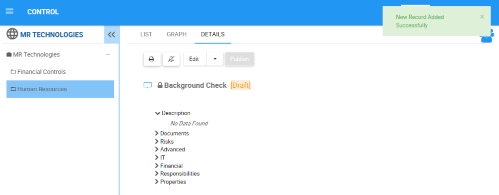 - The new Control “Acceptance of a fraudulent application” is now inside of the “Human Resources” folder. This Control is currently a draft. To learn how to publish Control objects, click here