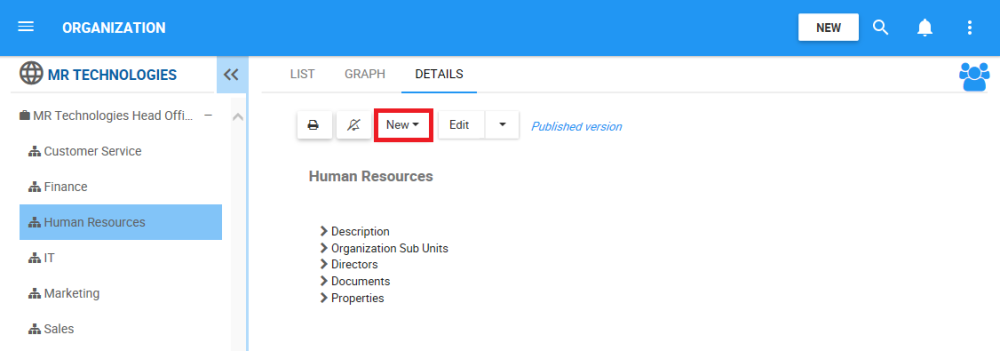 The New button enables Web Modelers to create new objects on the EPC Web App.