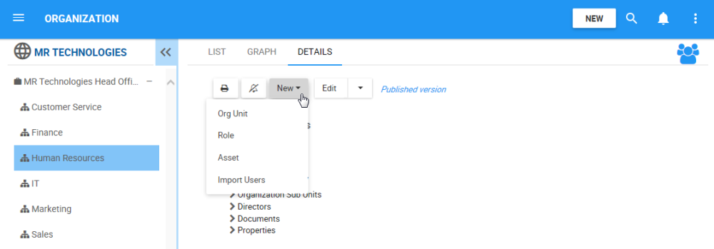 - A drop-down will be generated where you can choose the new item you want to create. In this example, the drop-down will show all the objects that can be created within an Organization Unit.