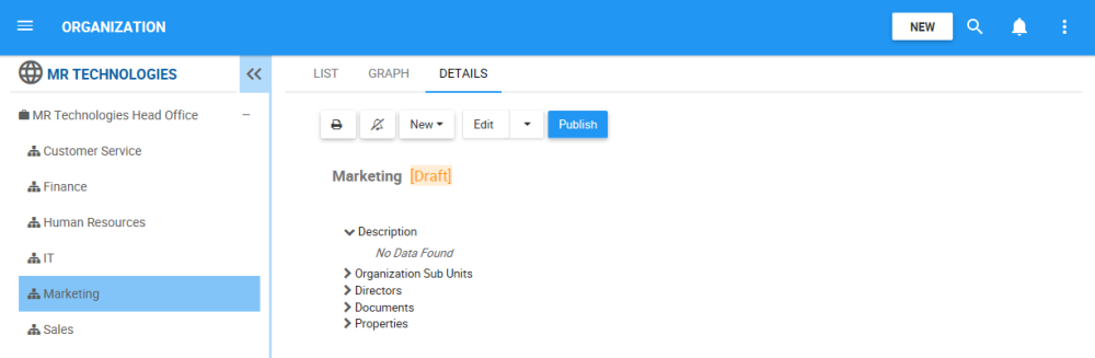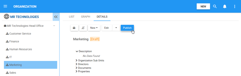 - Navigate to the details section of the object that is currently a draft. In this example, an Organization Unit