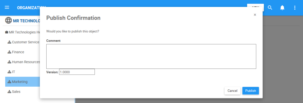 - The Publish Confirmation window for the object will be generated. You can input a comment and view/update the version number. The version number can only be higher than the previous version number.