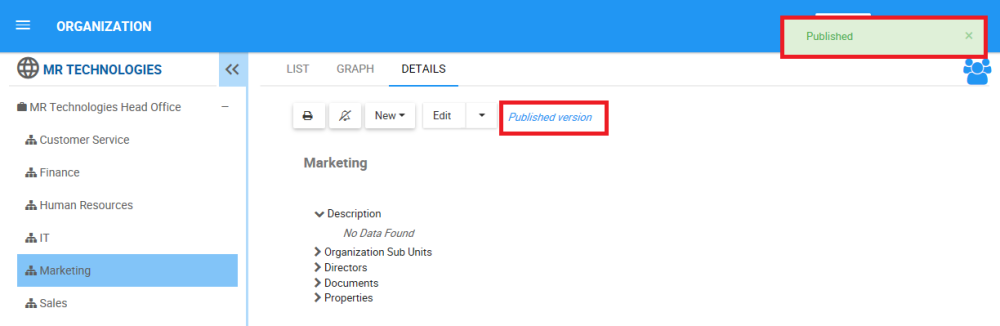 - The object will be published. You will receive a notification saying the object was successfully published. “Published Version” will be written on top of the object’s details tab, enabling Web Modelers to know the displayed content of the object is published.