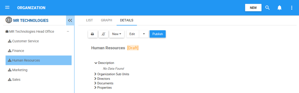 - The new Organization Unit “Human Resources” is now on the Organization tree structure. This organization unit is currently a draft. To learn how to publish Organization objects, click here