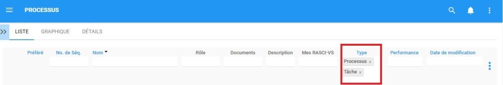 Vous pouvez ajouter des filtres pour voir les processus et autres objets de flux spécifiques de votre choix. Tapez ce que vous recherchez (No séq, Nom), sélectionnez le filtre dans le menu déroulant (Rôle, Documents, Description, Mon RASCI-VS, Type, Performance), ou définissez la plage de dates (Date modifié).