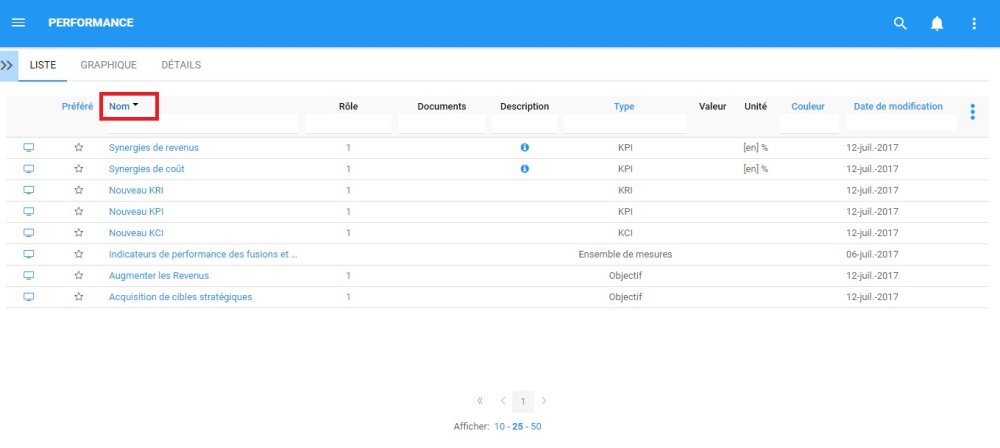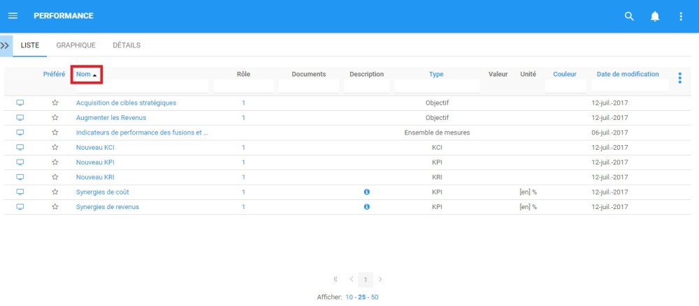 Le tri permet aux utilisateurs de classer les objectifs et les mesures de performance en fonction des critères sélectionnés. Vous pouvez trier la liste des résultats pour n’importe quel titre de colonne qui est écrit en BLEU.