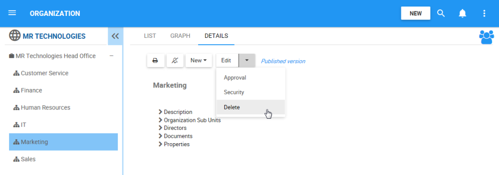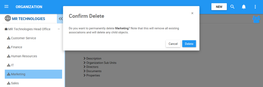 box. In this example, the Organization Unit “Marketing” and all its roles, assets and resources will be deleted.