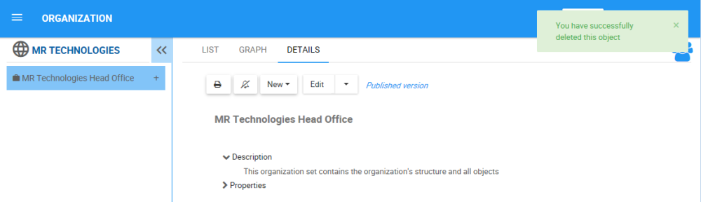 - You will be redirected to the details tab of the parent of the object and you will receive a notification saying the object was successfully deleted. In this example, the parent is the Organization Unit Set.