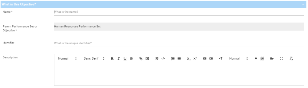 | Parent Performance Set or Objective | The Performance Set or Objective under which this Objective is nested. |