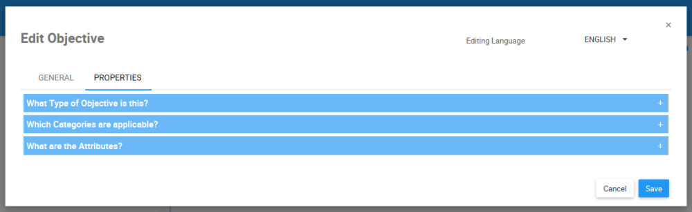 The Properties tab contains sections for the type, the categories applicable and the attributes.