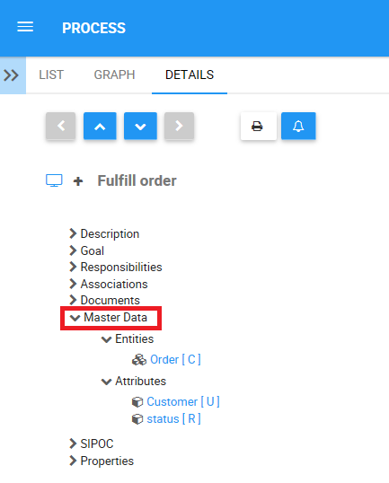 The Master Data section provides users with information about the Entities and Attributes that are linked to the process as well as their level of CRUD (Create, read, update, delete).