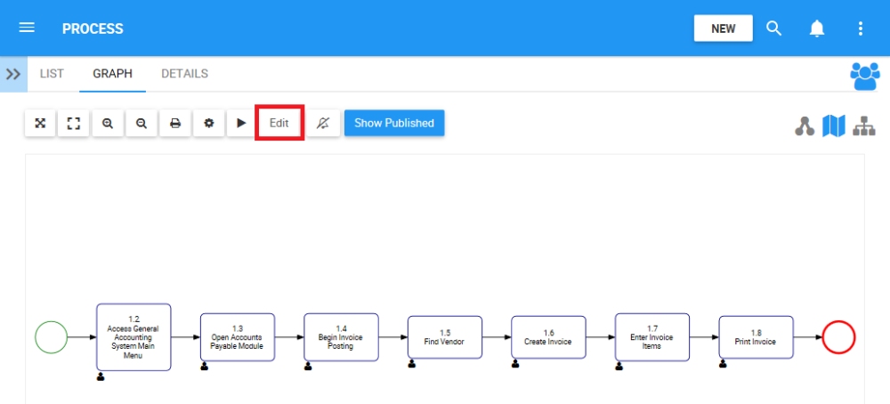 The Edit Button is the function allowing Web Modelers to edit a graph. Only Web Modelers will be able to see this button on the toolbar. When clicking on this button, Web Modelers will go on Edit Mode and be redirected to the Full Screen Edit Mode where they can map and edit processes.