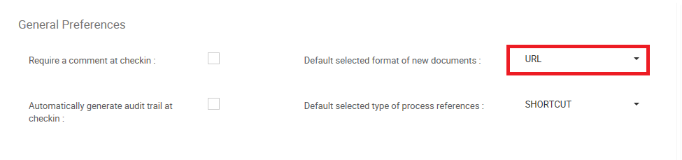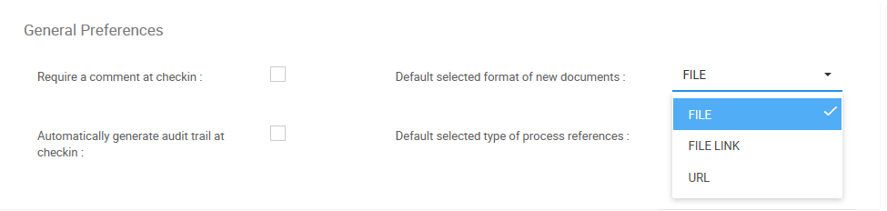 | Default selected format of new documents | System admin can choose File, File Link or URL as a default document format |