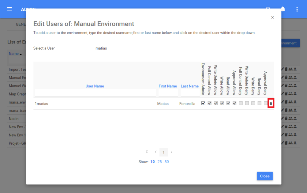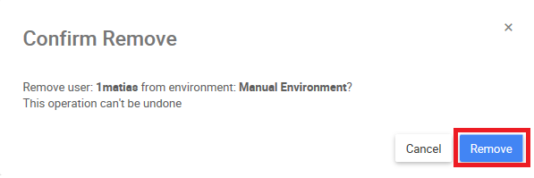 3. The following box will appear, select the “Remove” box to remove an user from an environment
