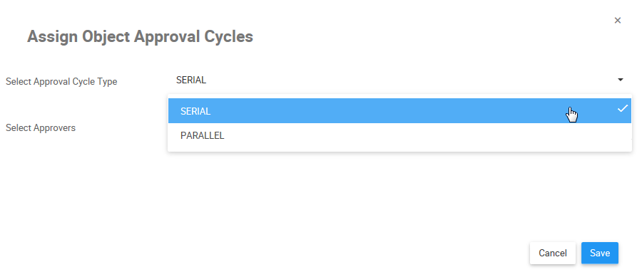 | Serial | Approval cycle following a sequential of approvers. Approval requests are first sent to the initial approver. Upon approval, a secondary approval request will be sent to the following approver and so on. E.g. First approval request sent to a controller, then the VP Finance and finally the CEO. |