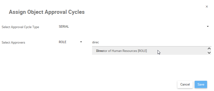 - Type the name of the Role you want to assign as the approver. From the search suggestions, click to select the Role you want to assign