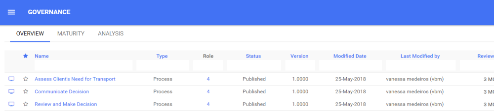 Governance and oversight is a crucial factor in Business Process Management and Business Process Optimization. Governance provides individuals with the ability to oversee processes, analyze and assess their effectiveness at their current state, while planning for improvements in the future. This in mind, the EPC Governance Module is divided into 3 tabs: