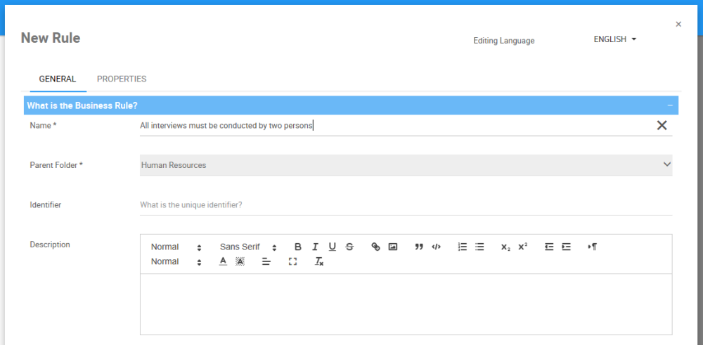 For this example, the name of the Rule is “All interviews must be conducted by two persons”