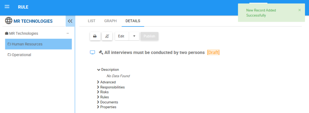 - The new Rule “All interviews must be conducted by two persons” is now inside of the “Human Resources” folder. This Rule is currently a draft. To learn how to publish Rule objects, click here