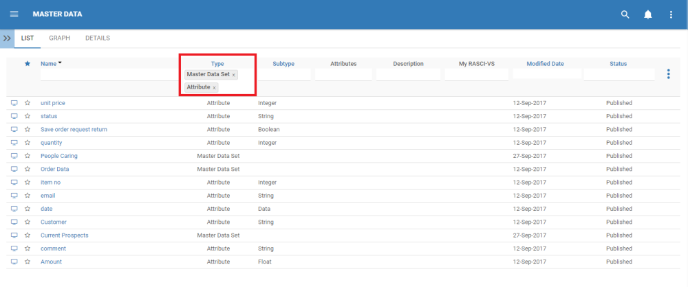 3. Select the desired filter. For this example, we will select Attribute and Master Data Set.