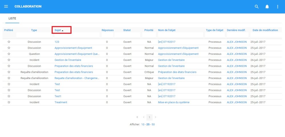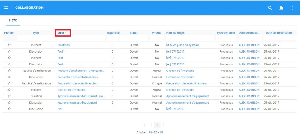 Le tri permet aux utilisateurs de classer les documents en fonction des critères sélectionnés. Vous pouvez trier les résultats de la liste pour n’importe quel titre de colonne qui est écrit en BLEU.