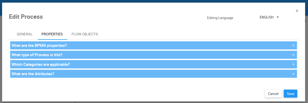 The Properties tab for Processses contains sections for the BPMN Properties, the type, the categories applicable and the attributes.