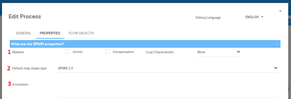 Annotations serve as textual support on the process map. Each Process and Flow Object can have one annotation, which will display the text input in this field on the map attached to the relevant shape as show below.