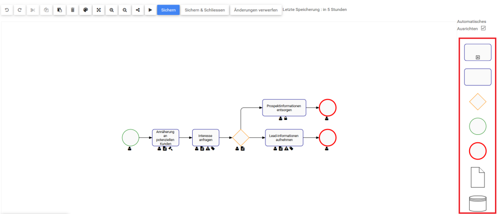 Web Modeler können Prozesse direkt auf der Web App abbilden. Das Formmenü ist im Vollbildmodus verfügbar, diese Formen werden verwendet, um die Prozesse des Unternehmens abzubilden. Der EPC unterstützt die BPMN 2.0 als standardisierte Modellnotation zur grafischen Darstellung bestimmter Prozesse auf einer Karte.