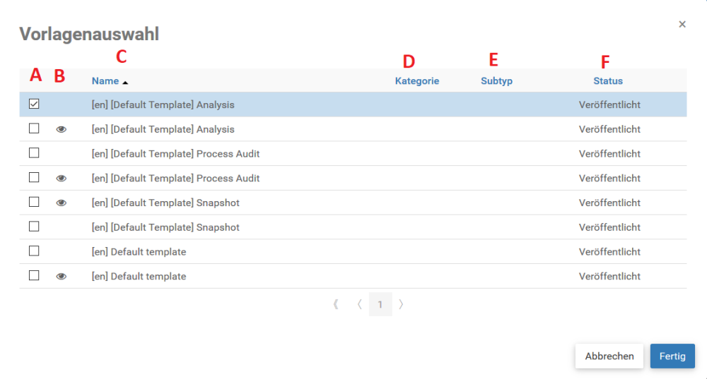| A | Checkbox | Wählt die Vorlage aus |