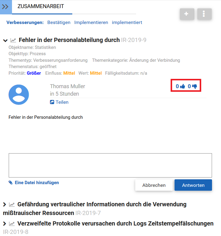 Die Abstimmung erfolgt über das Symbol Benutzer können abstimmen, indem sie auf die Schaltfläche “Thumbs Up” oder “Thumbs Down” klicken. Abhängig vom Szenario können Benutzer freiwillig oder beauftragt werden, über Kooperationsverträge abzustimmen.