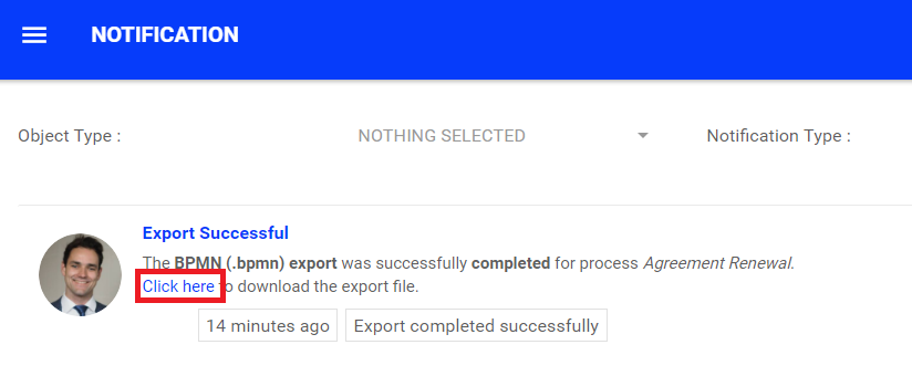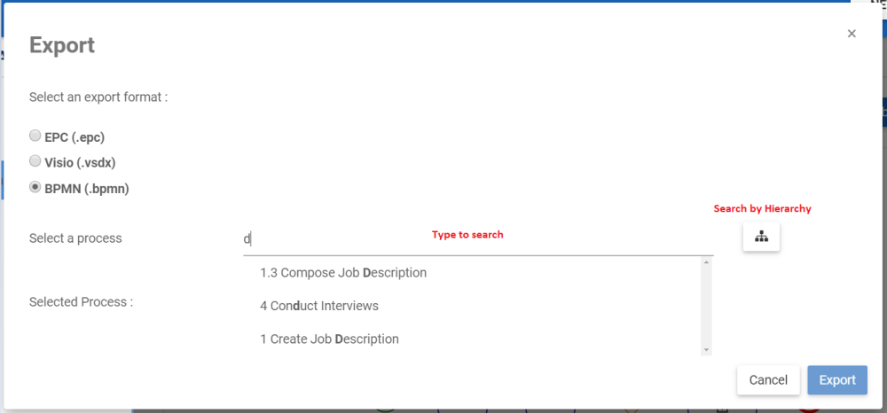 4) Type to search for the process you wish to export, or search by hierarchy. Click to select it among the results list.