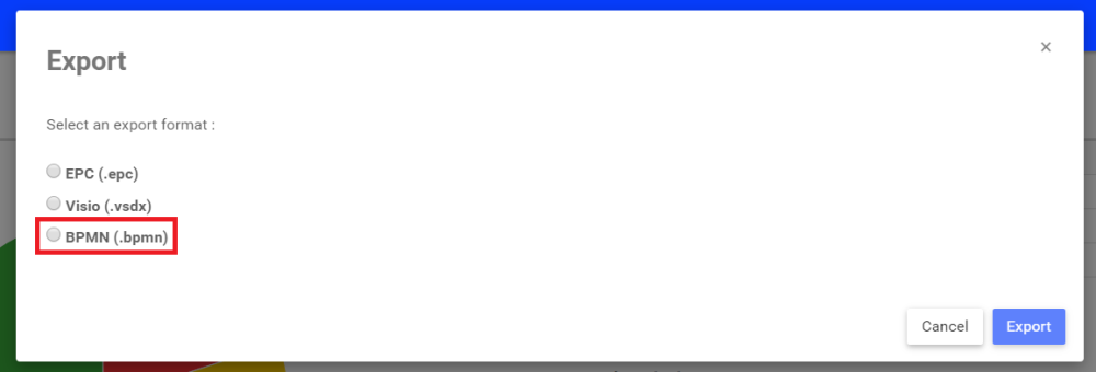Users can export EPC processes to .bpmn format. This export capability allows users to select individual processes and export them for viewing in alternative BPMN platforms.