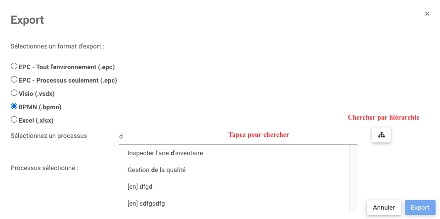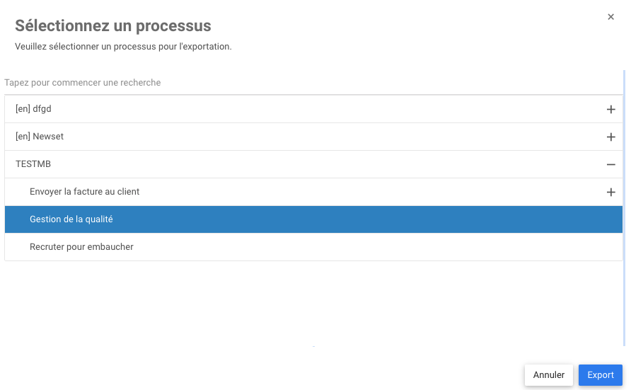 5. Si vous recherchez par hiérarchie, sélectionnez le processus que vous souhaitez exporter, puis cliquez sur Export. La fenêtre se fermera et vous serez ramené à la page d’exportation initiale.