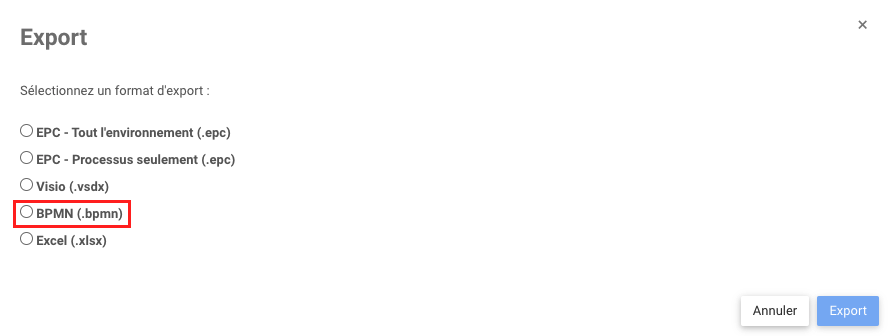 Les utilisateurs peuvent exporter les processus EPC au format .bpmn. Cette capacité d’exportation permet aux utilisateurs de sélectionner des processus individuels et de les exporter pour les visualiser sur des plates-formes BPMN alternatives.