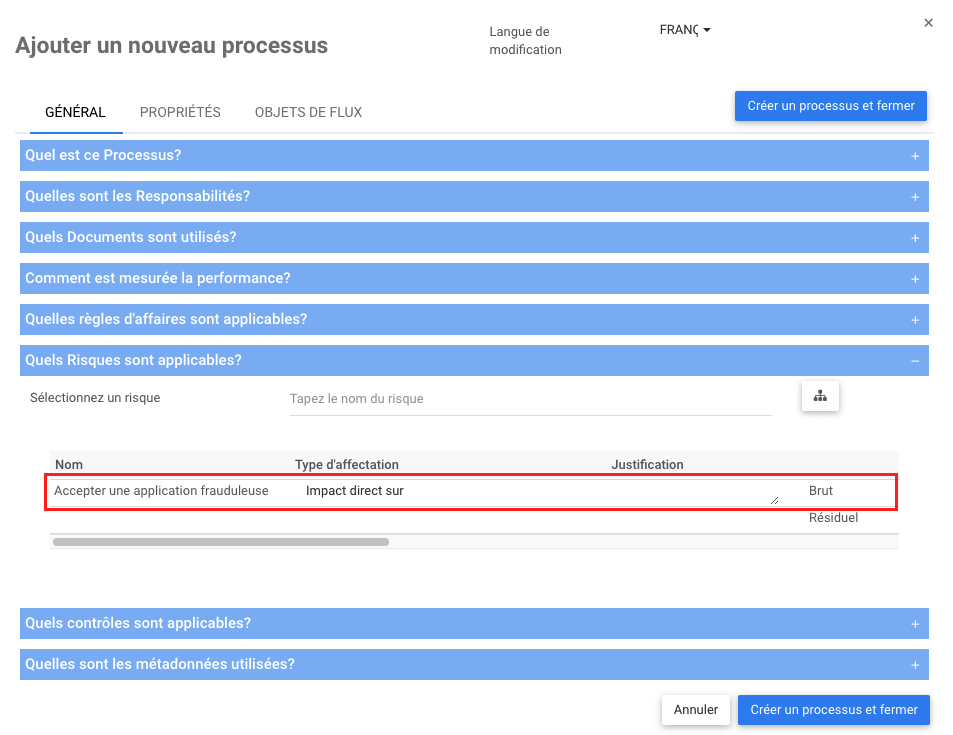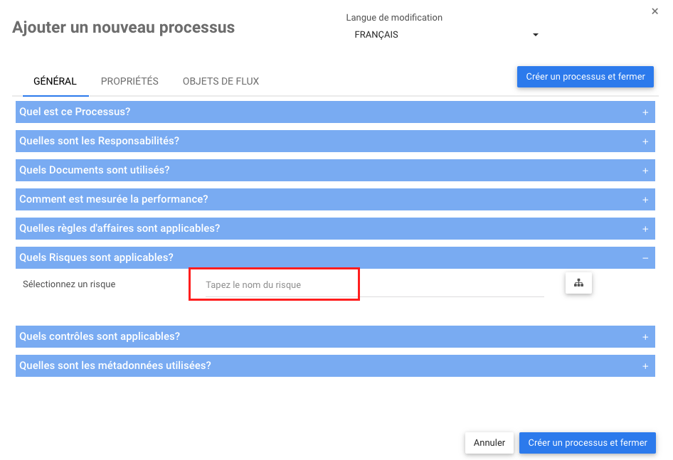 Les risques sont utilisés pour identifier et évaluer les risques. Ils peuvent être associés à des processus ou des objets de flux (tâches, événements et passerelles), des règles, des indicateurs de performance et des risques (en tant que sous-risques). Les risques sont créés et gérés dans le module Risques. Dans cette sous-section des détails généraux, les modélisateurs Web peuvent associer des risques à des processus ou des objets de flux spécifiques (tâches, événements et passerelles), des règles, des indicateurs de performance et des risques (en tant que sous-risques) partout où ils s’appliquent.