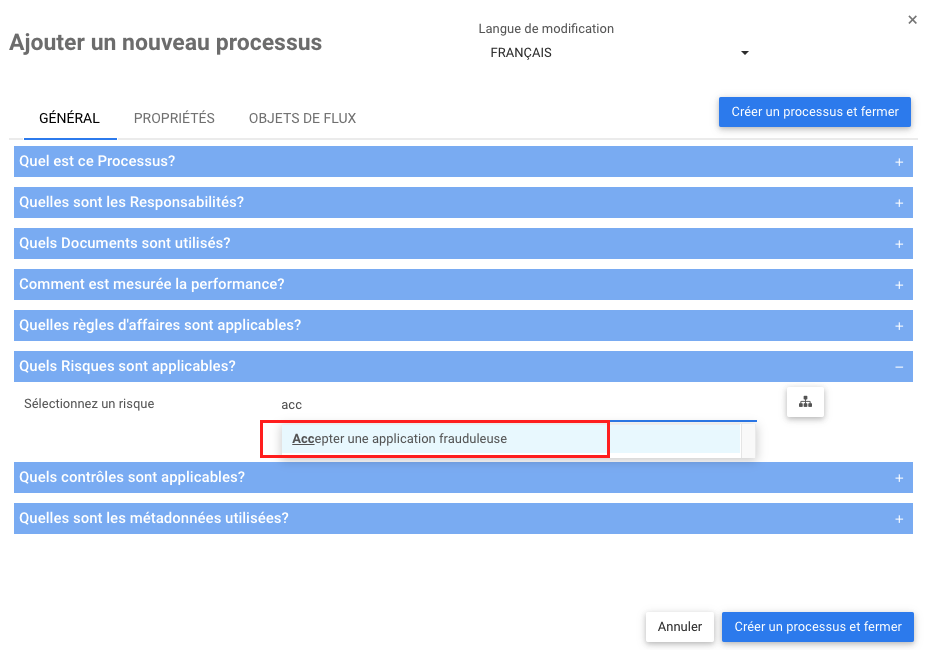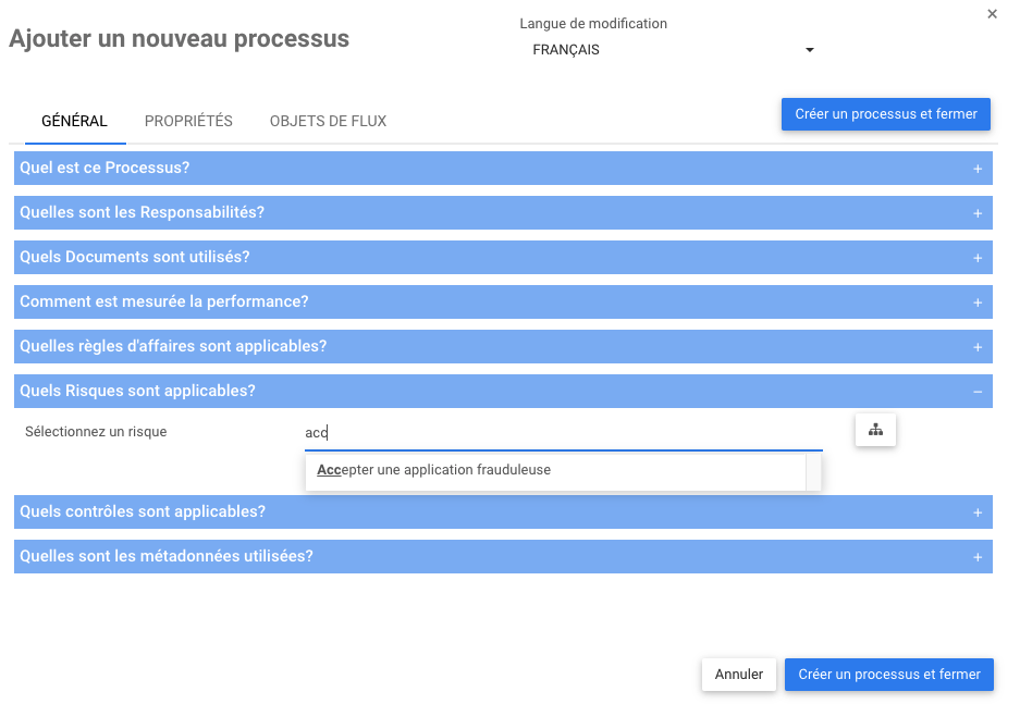 Cette section est disponible sous la forme d’édition des processus ou des objets de flux (tâches, événements et passerelles), des règles, des indicateurs de performance et des risques (en tant que sous-risques).