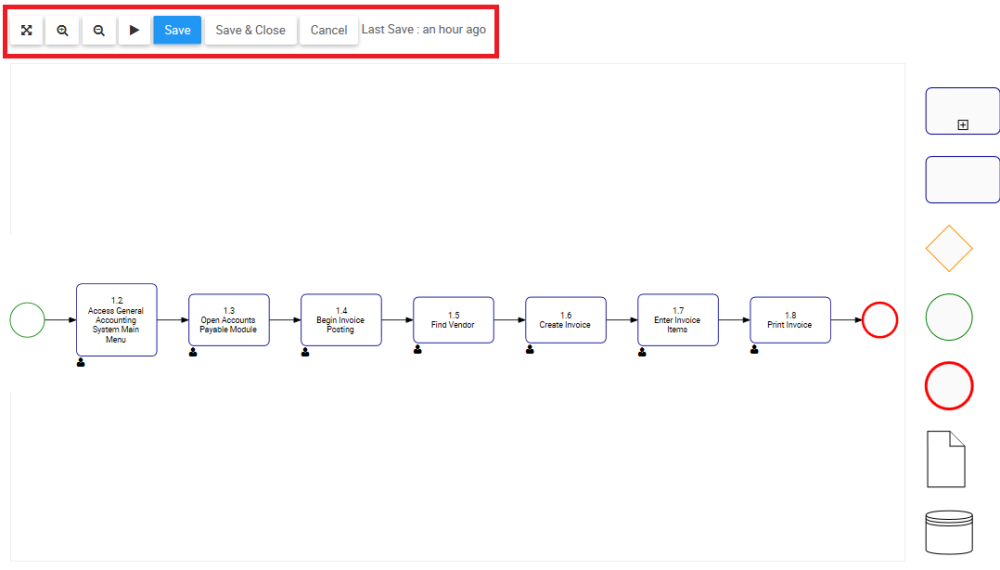 La barre d’outils graphique met l’accent sur le visionnage par l’utilisateur et sur l’édition de fonctionnalités graphiques aidant les modeleurs Web à modeler les processus.
